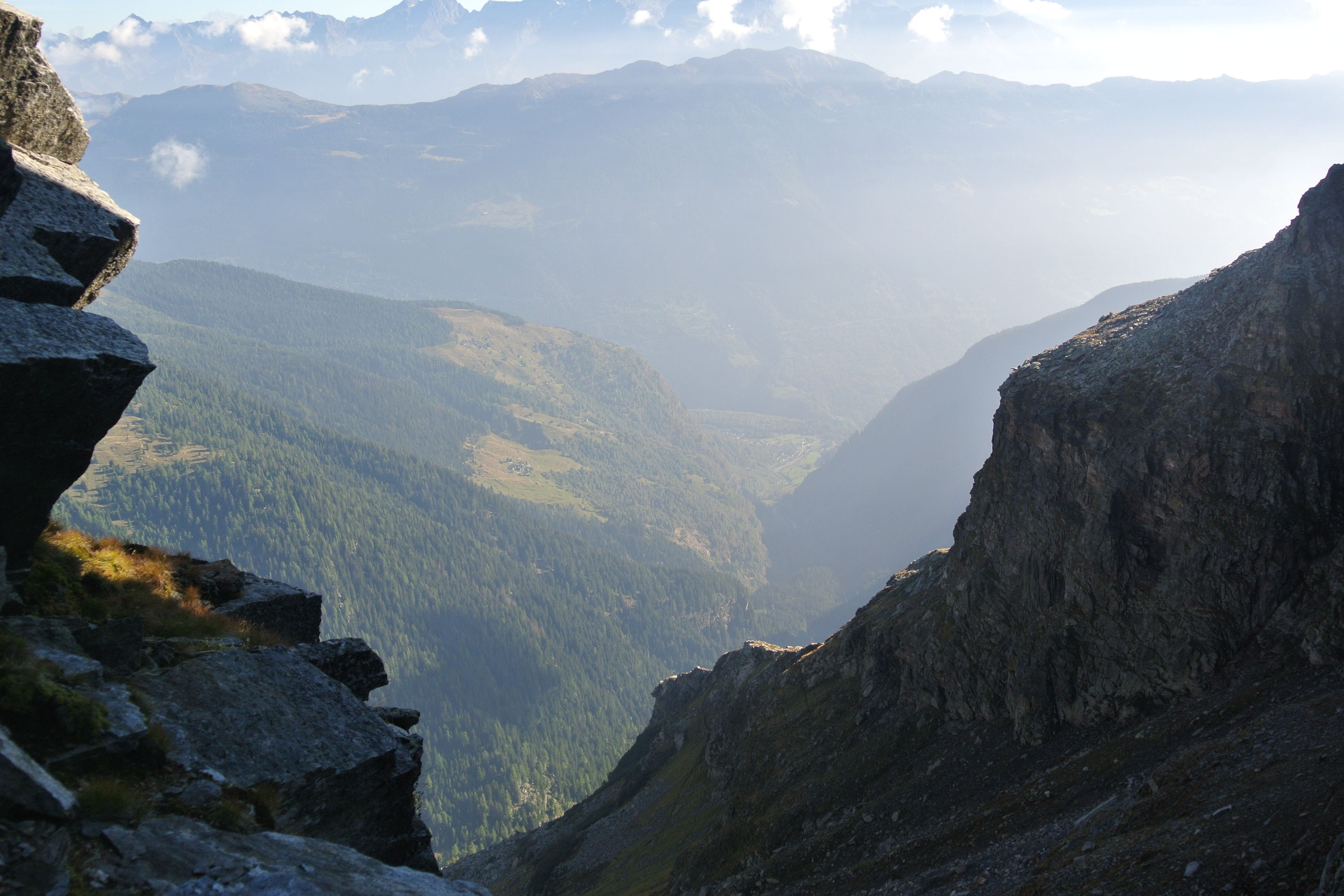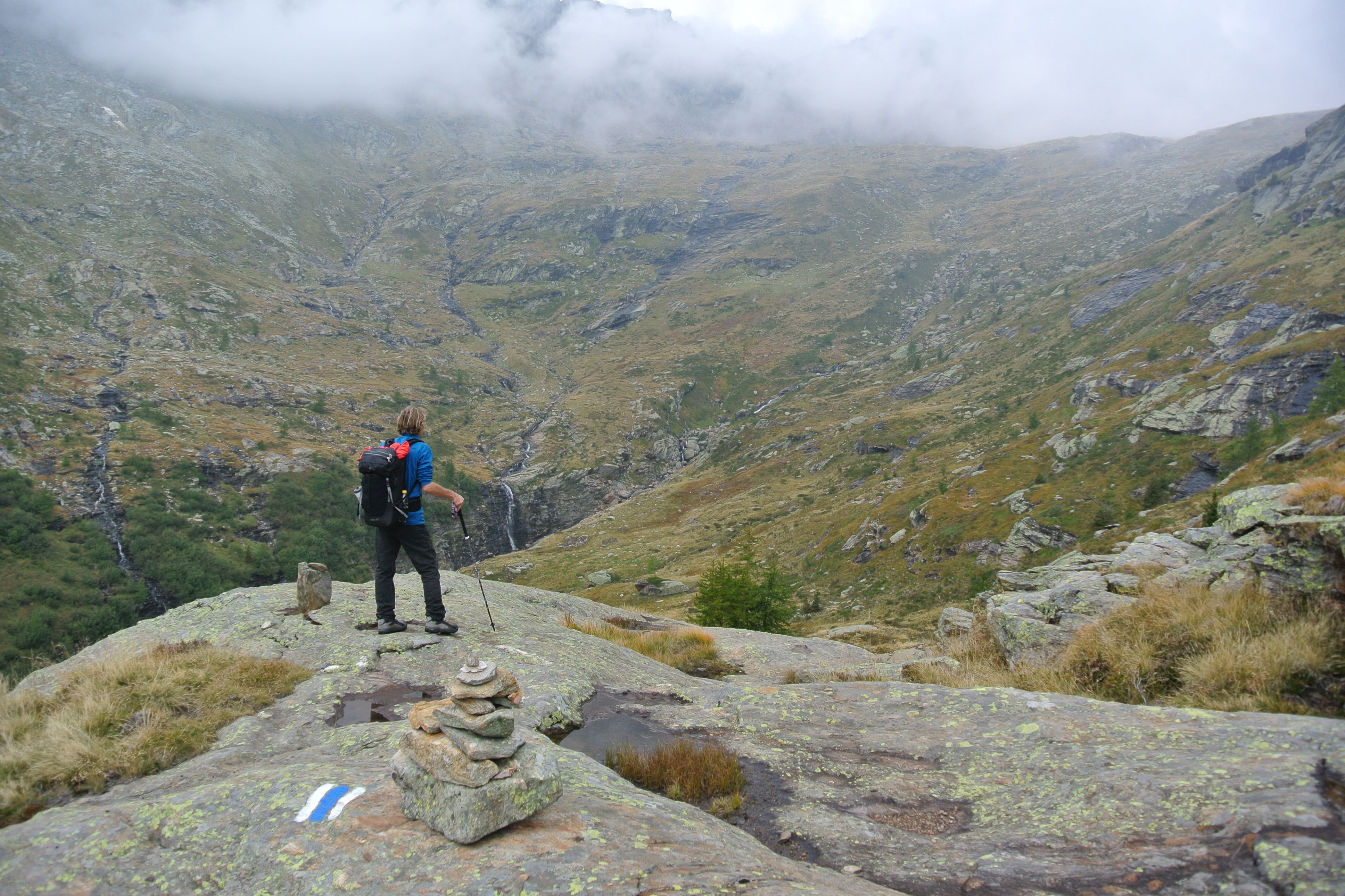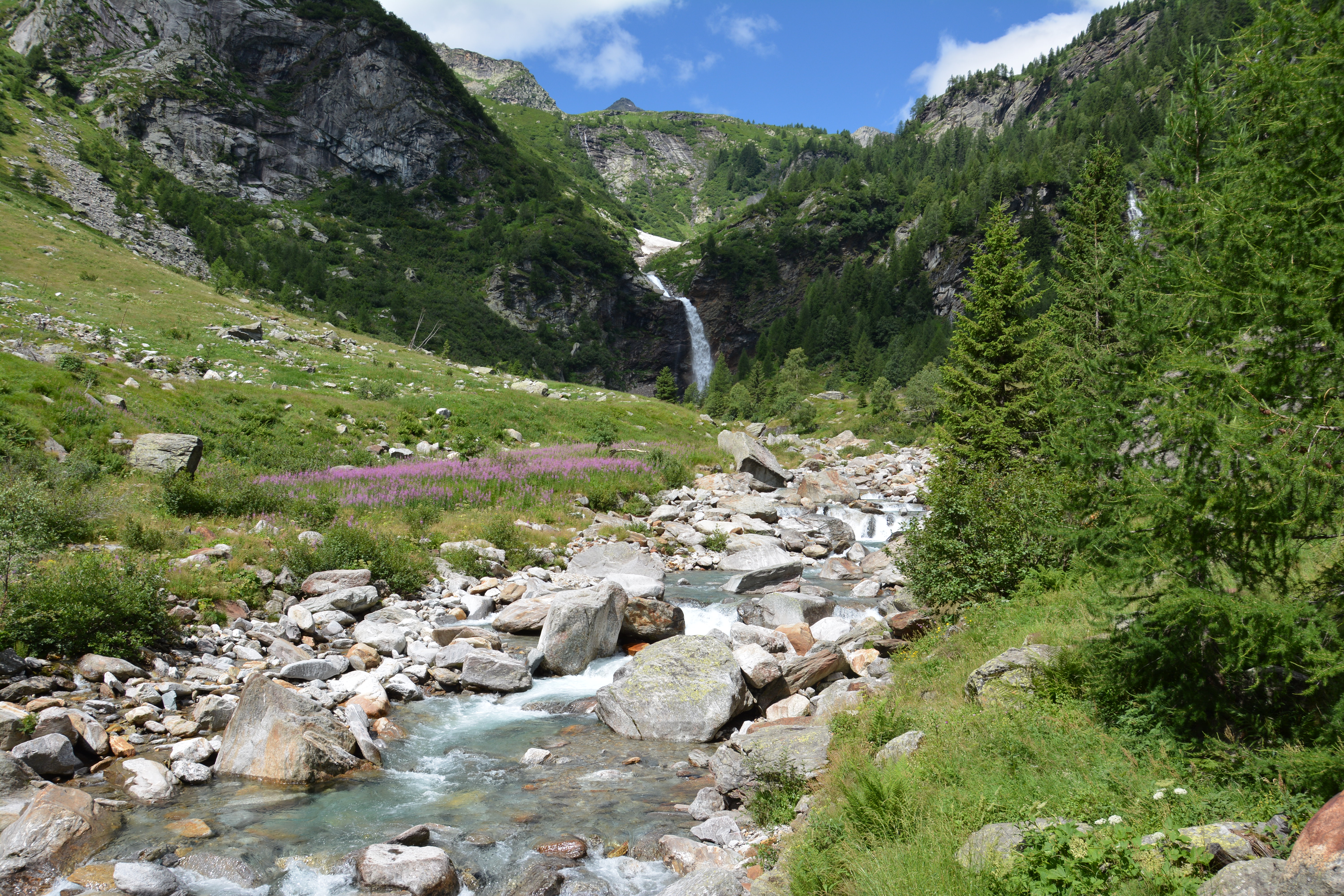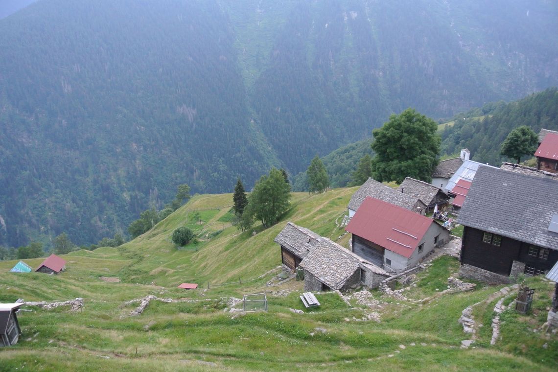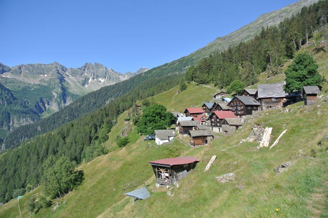 Am Talende stürzt der Ticinetto als eindrücklicher Wasserfall «Cascata di Valle» von den Felsen. Ein gepflasterter Saumweg führt in unzähligen Kehren die eine Talseite hoch und gewinnt rasch an Höhe, denn ab hier wird’s alpin. Die Flora und Fauna mit ihrem augensättigenden Grün tut sich nochmals auf für die Sonnenterassen «Cala» und «Doro», der Weg – nun schmaler Wanderweg – steigt weiter der Baumgrenze entgegen und darüber öffnet sich ein weiter Talkessel, der von beeindruckend hohen Gipfeln umgeben ist.