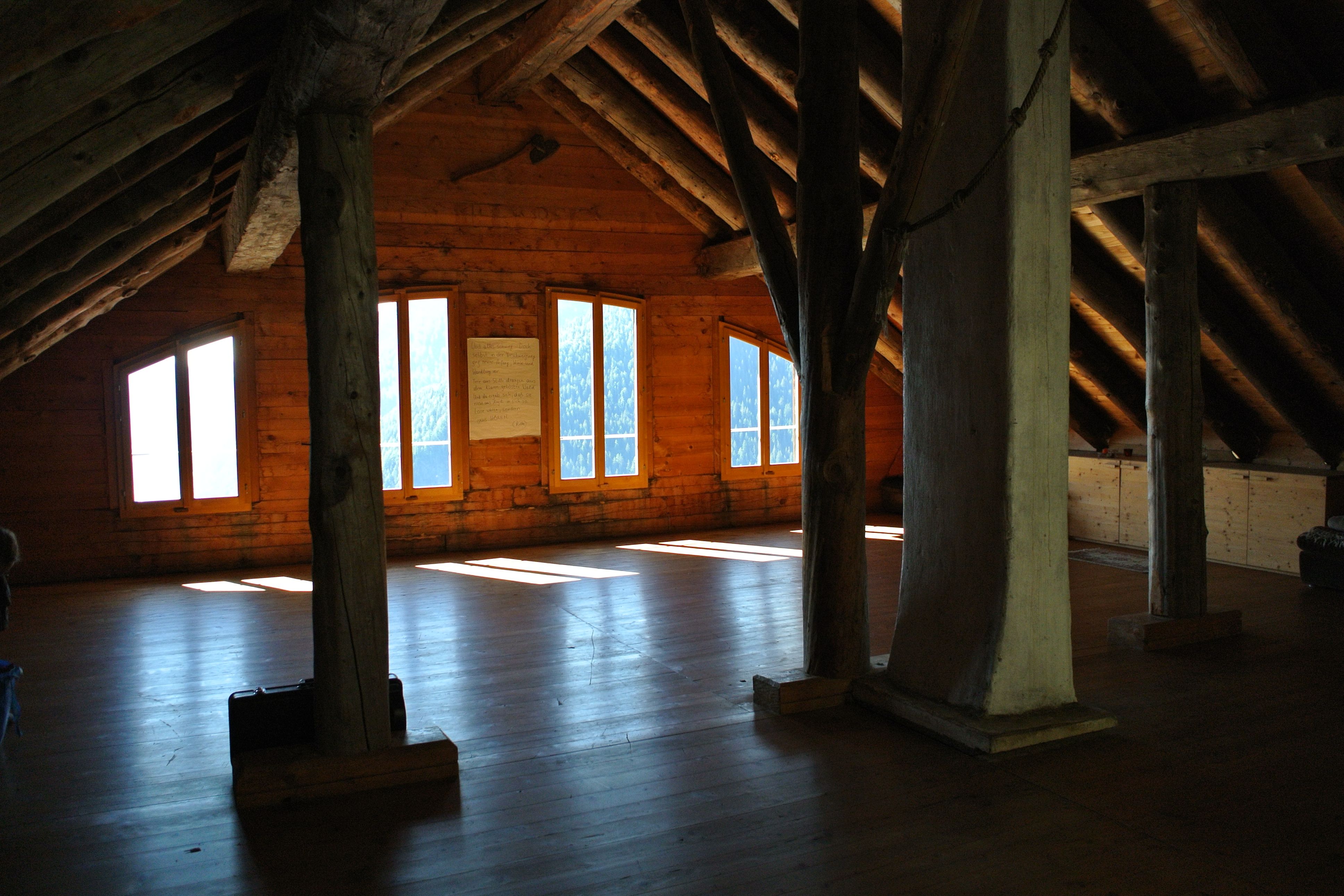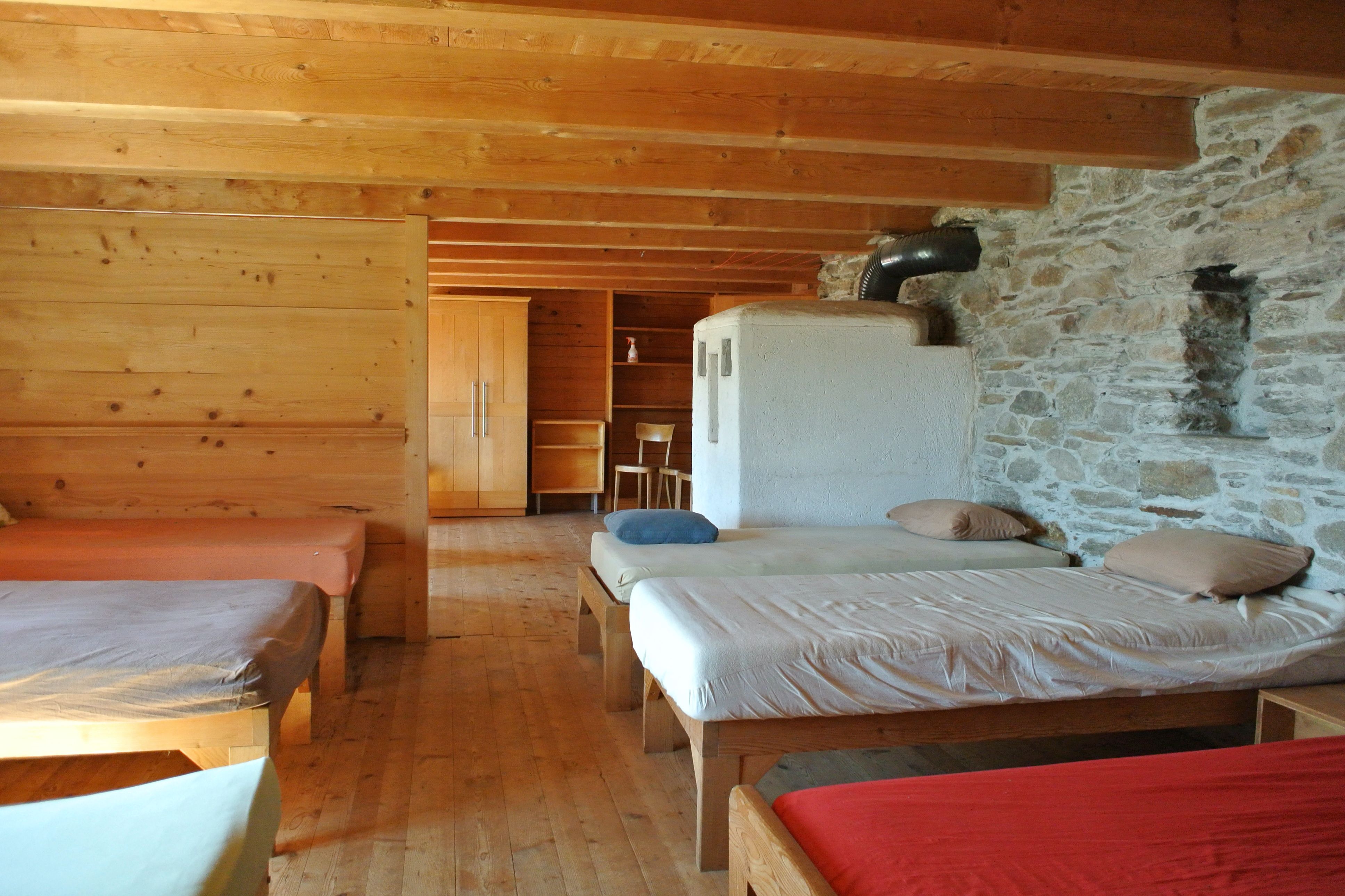 Das Lärchenhaus ist unsere «Arche», Rückzugsort und Ausgangspunkt für unsere Begegnungen mit der Bergwelt. Im obersten Geschoss bietet ein grosser, hoher und heller Raum aus Holz beste Bedingungen für unsere Gruppenaktivitäten und einen wunderbaren Ausblick auf den Süden der Leventina. Der Wohn- und Essraum sind unser Treffpunkt und Drehscheibe für unsere Unternehmungen. Er wird mit einem grossen Steinofen beheizt. Da ist Raum für Gespräche und genügend Platz, um zu lesen, zu schreiben oder gar zu zeichnen.